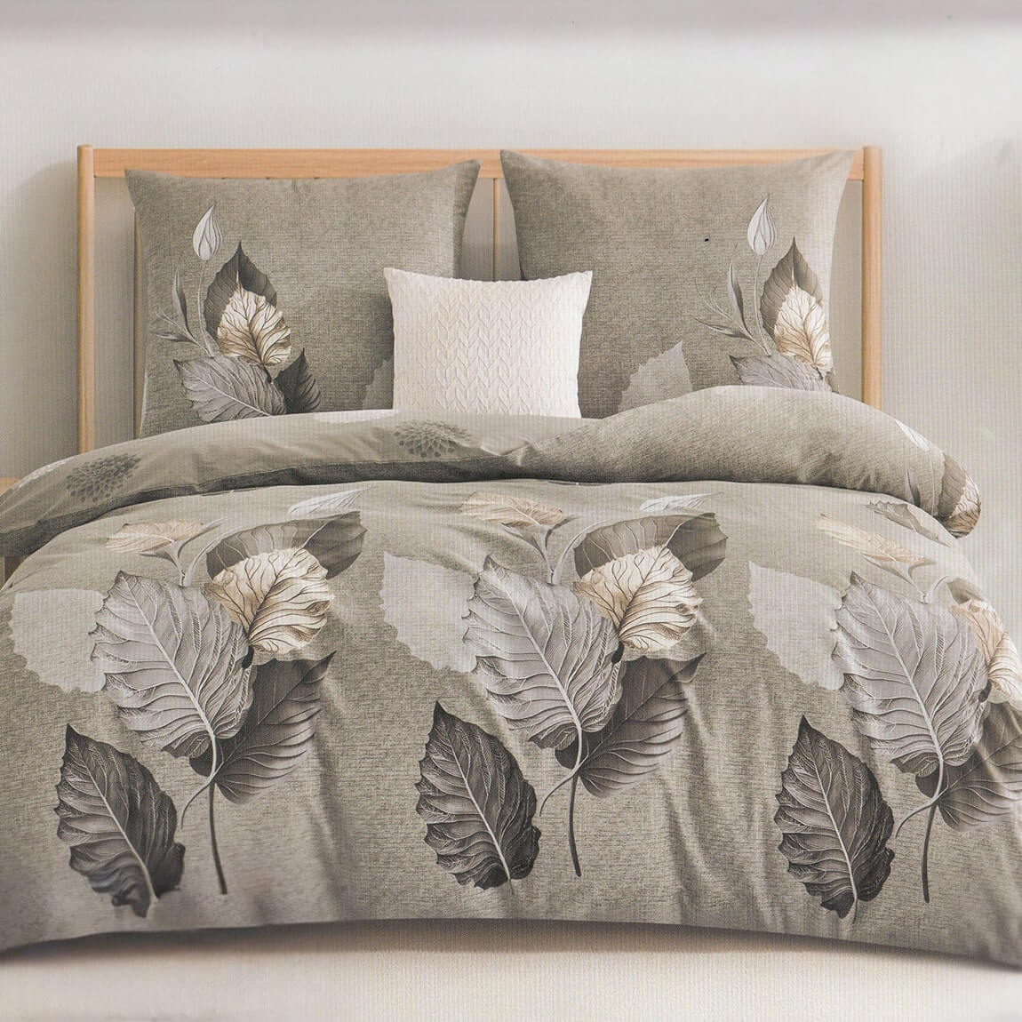 Pościel w duże realistyczne liście w beżu, szarości i kawie z mlekiem. Strukturalne tło dodaje głębi. Idealna do sypialni skandynawskiej i klasycznej.