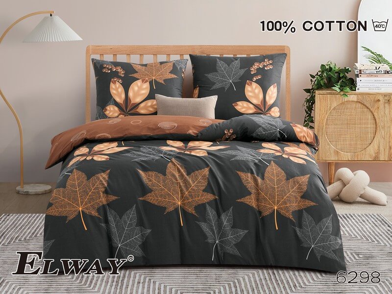 Pościel Elway w jesiennym klimacie. Na pierwszy plan wkraczają wielkie pomarańczowe liście klonu. Druga strona w ciepłym brązie idealnie komponuje się z czarnym wierzchem.