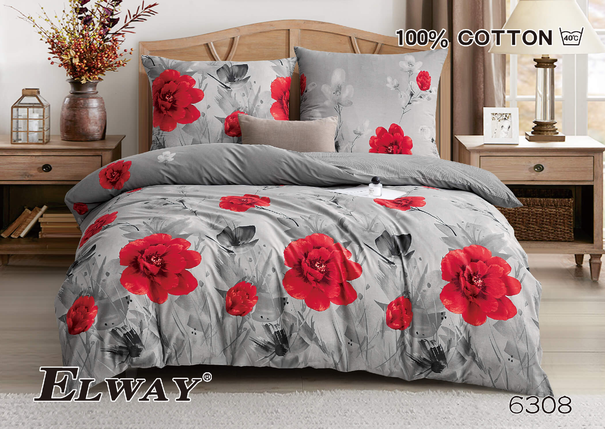 Pościel o szarej kolorystyce z pięknymi, dużymi, czerwonymi kwiatami. Druga strona w delikatne zawijasy, które tworzą lekki wzór.
