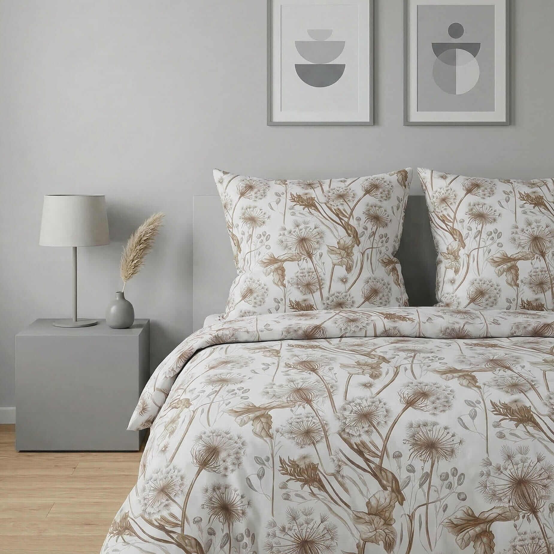 Pościel bawełniana Dewa z eleganckim wzorem roślinnym w odcieniach beżu i brązu na jasnym tle. Delikatne dmuchawce i liście nadają jej subtelny, naturalny charakter, idealny do stylowych i przytulnych wnętrz.