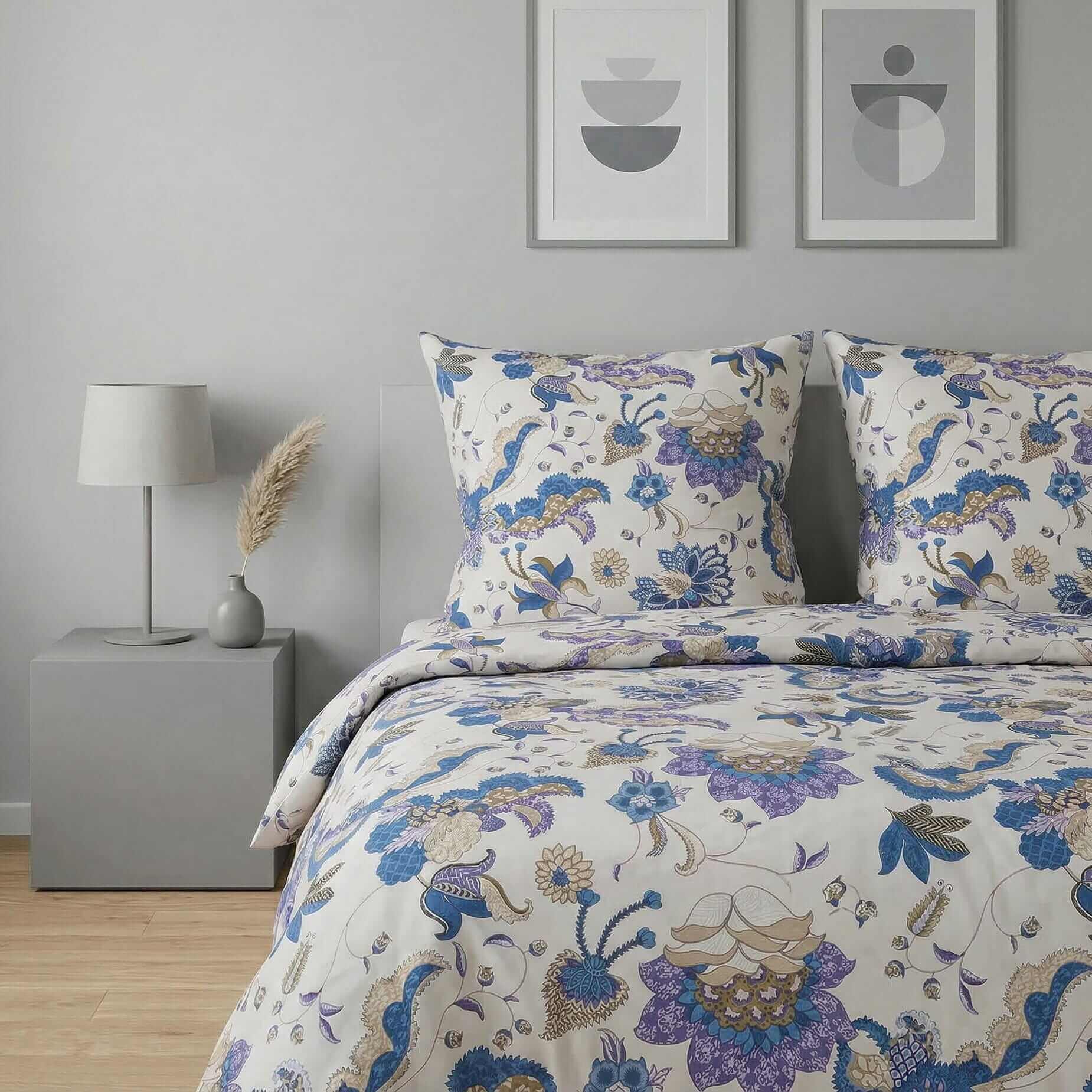 Pościel z wzorem finezyjnie rozrzuconych kwiatów i liści, tworząc harmonijną, naturalną kompozycję. Nada sypialni przytulny i relaksujący klimat.
