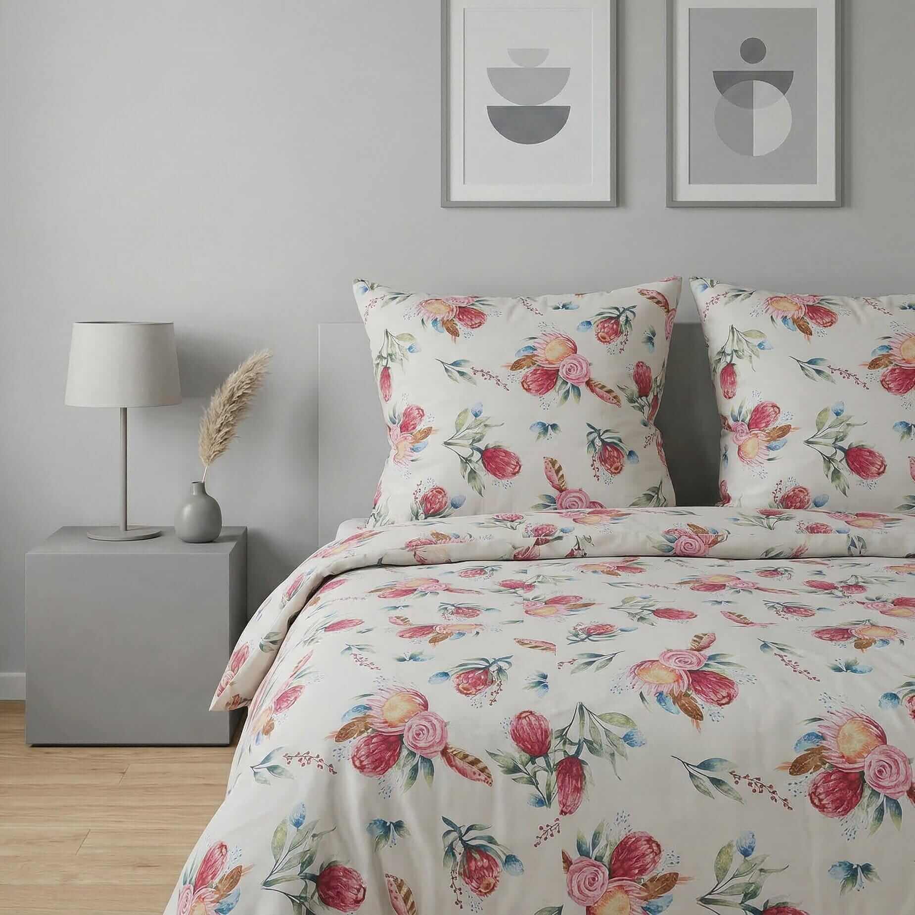 Pościel bawełniana z malarskim motywem egzotycznych kwiatów protei i róż na białym tle, ozdobiona barwnymi bukietami i dekoracyjnymi piórami.