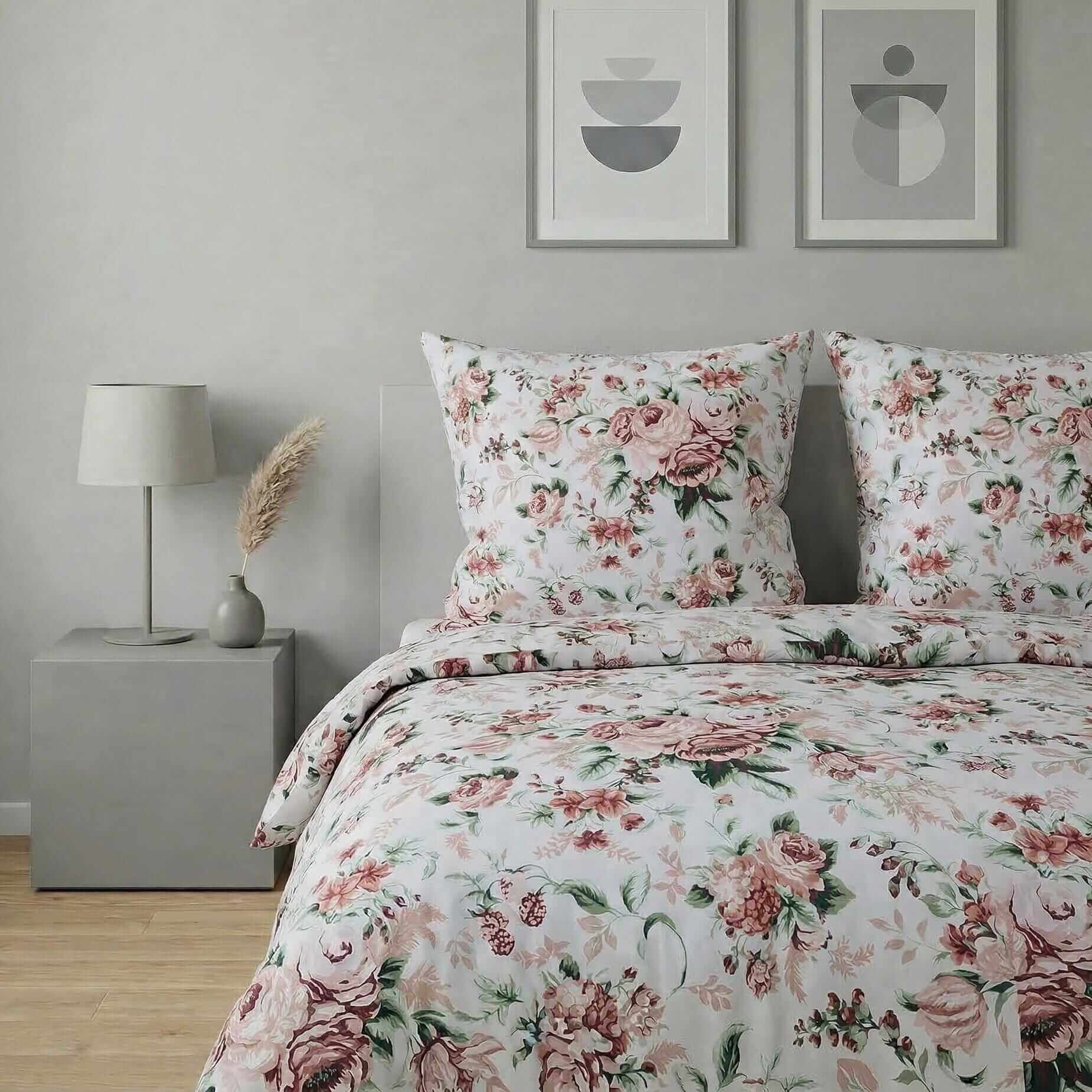 Pościel bawełniana z gęstym, angielskim motywem kwiatowym. Na białym tle eleganckie bukiety róż w odcieniach herbacianego różu i zieleni.
