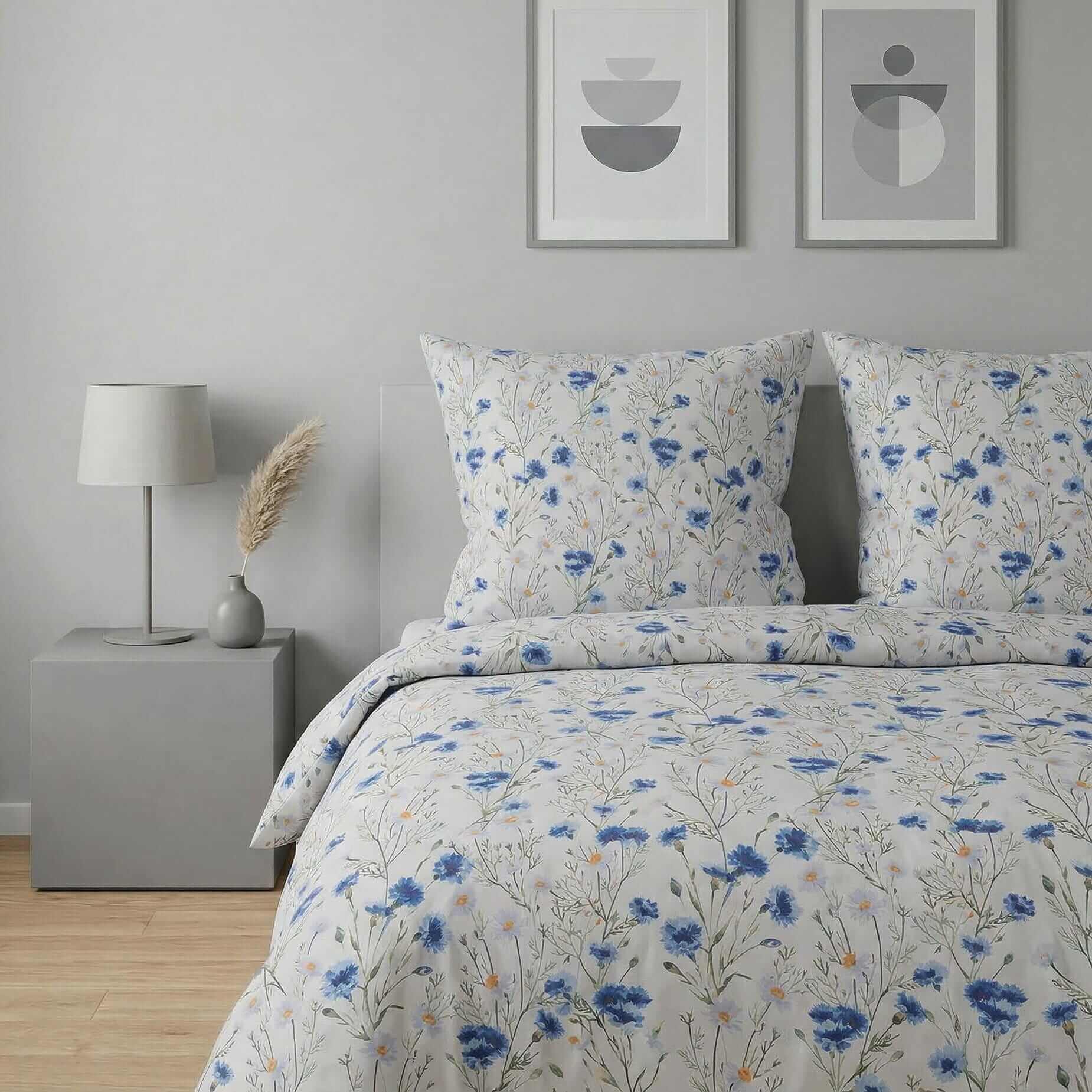 Pościel bawełniana w motywie polnych kwiatów. Niebieskie chabry i delikatne łodygi na białym tle tworzą sielski klimat Twojej sypialni.