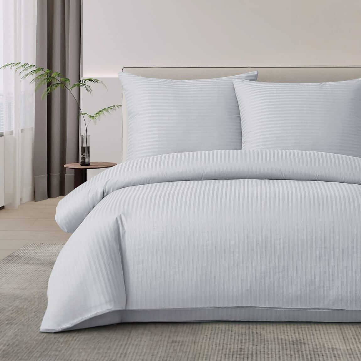 Pościel jednobarwna z adamaszku jasnoszara w pasy 1 cm zawiera: