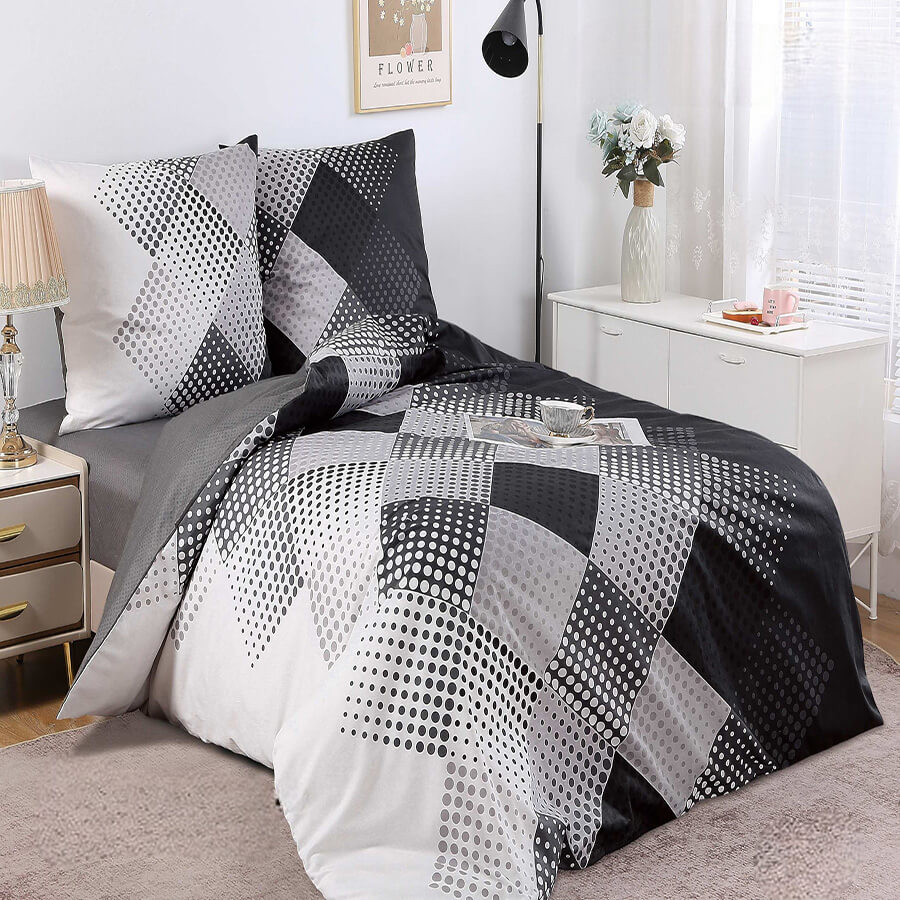 Pościel przedstawia wzór powtarzających się motywów geometrycznych.